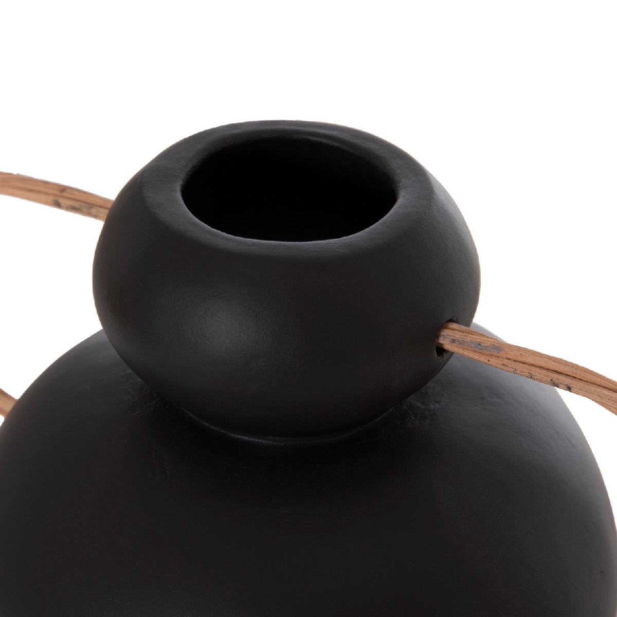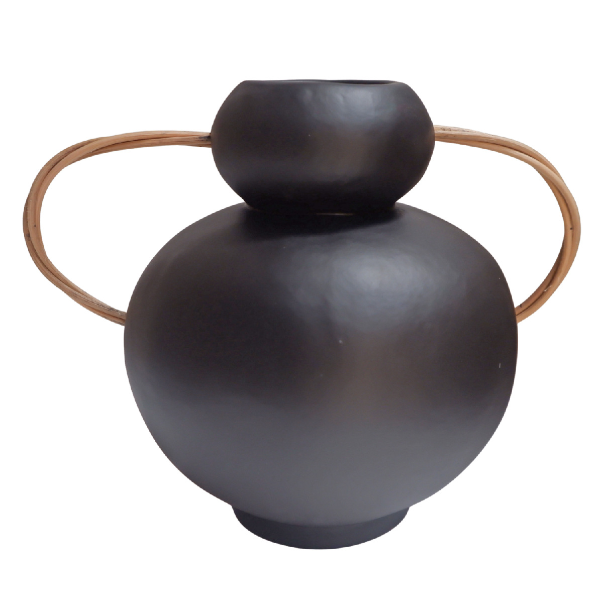 Το διακοσμητικό επιτραπέζιο βάζο της σειράς MIBO είναι χαμηλό και φαρδύ ενώ διαθέτει διακοσμητικά χερούλια από φυσικό rattan. Είναι σε ΜΑΥΡΗ απόχρωση και μπορεί να ταιριάξει οπουδήποτε το θελήσετε. Είτε στο σπίτι είτε σε επαγγελματικούς χώρους.