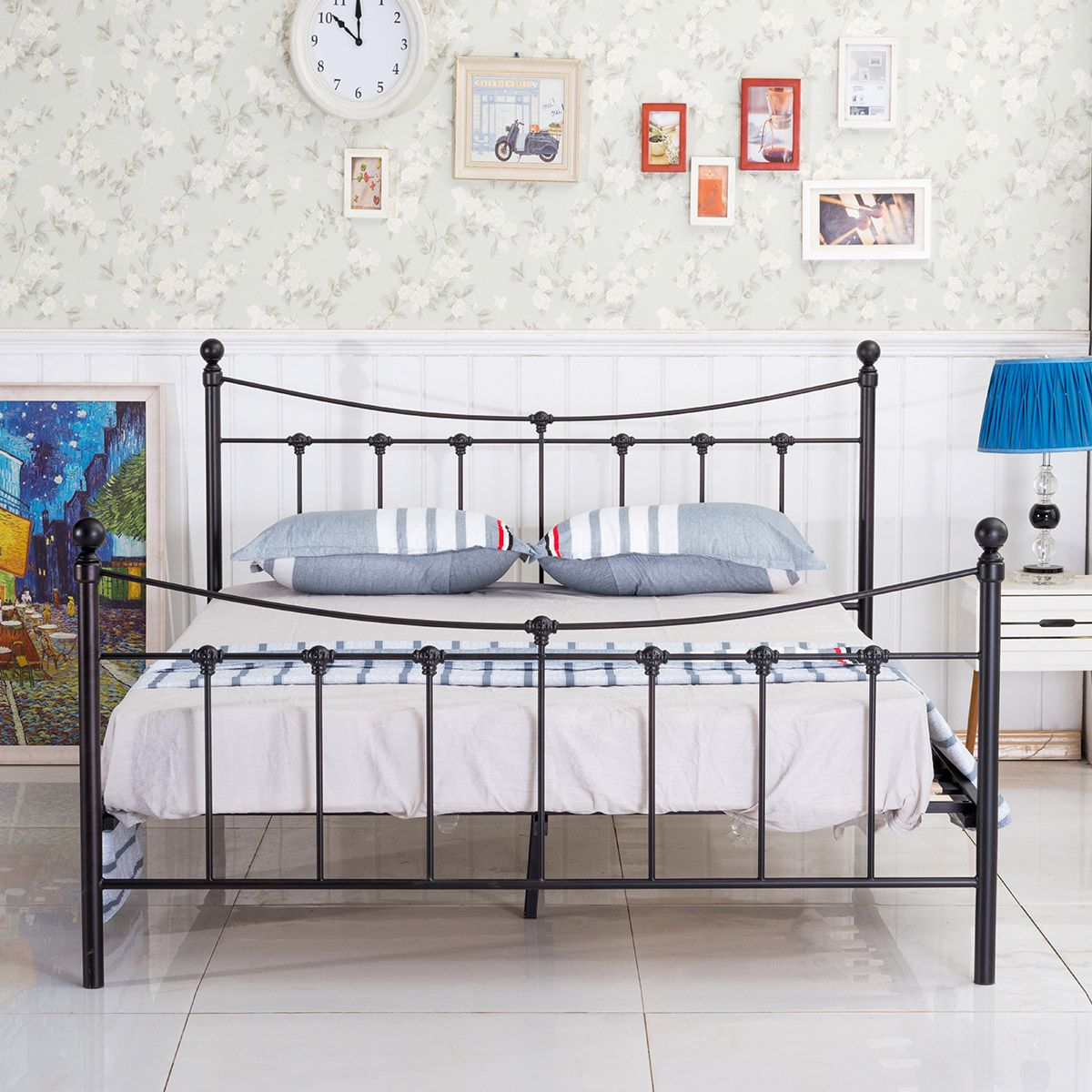 Μεταλλικό διπλό κρεβάτι σε μαύρο χρώμα με κεφαλάρι, με διακοσμητικά μοτίβα και ποδαρικό με καμπύλη. Διαθέτει μεταλλικό περιμετρικό σκελετό με μοντέρνα σχέδια, συμπεριλαμβάνονται ορθοπεδικές τάβλες. Είναι ένα διαχρονικό κρεβάτι που χρησιμοποιείται σε μοντέρνους χώρους.
