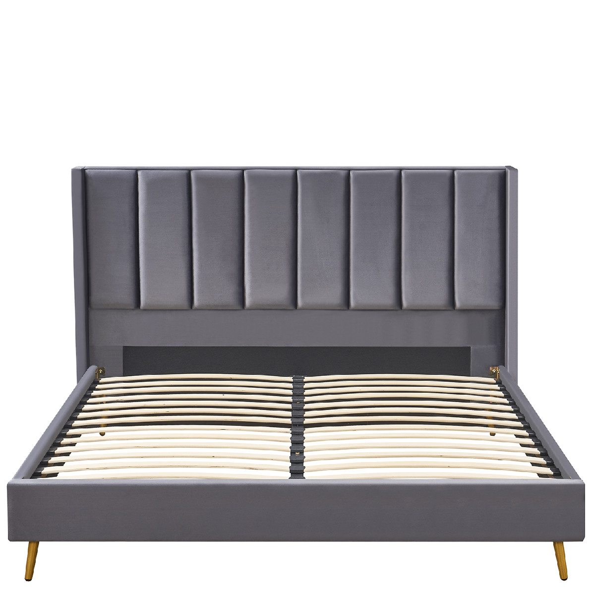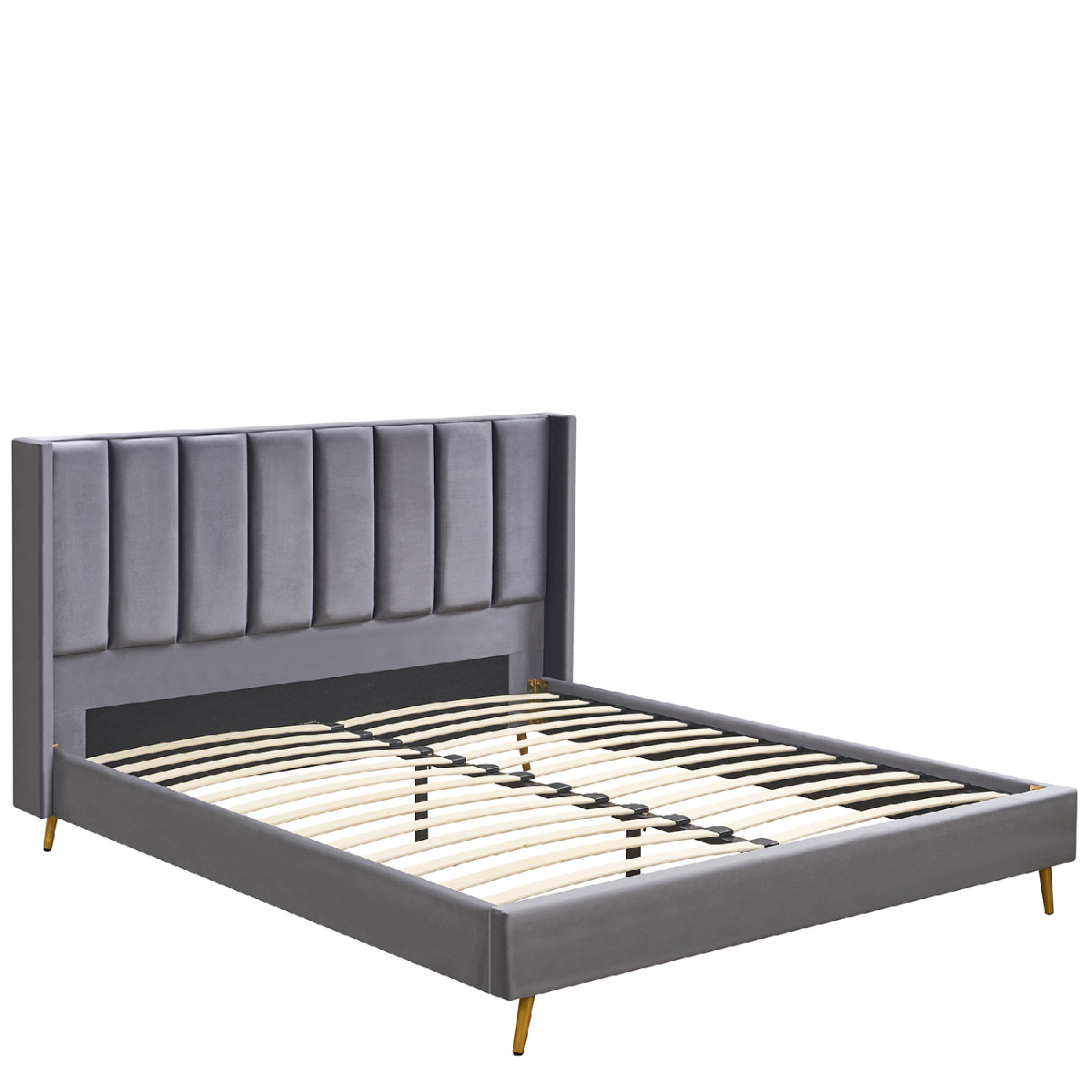 Το κρεβάτι είναι επενδυμένο με υψηλής ποιότητας γκρι ύφασμα, προσφέροντας ανθεκτικότητα και μοντέρνα εμφάνιση. Τα χρυσά μεταλλικά πόδια προσφέρουν επιπλέον στήριξη και σταθερότητα.