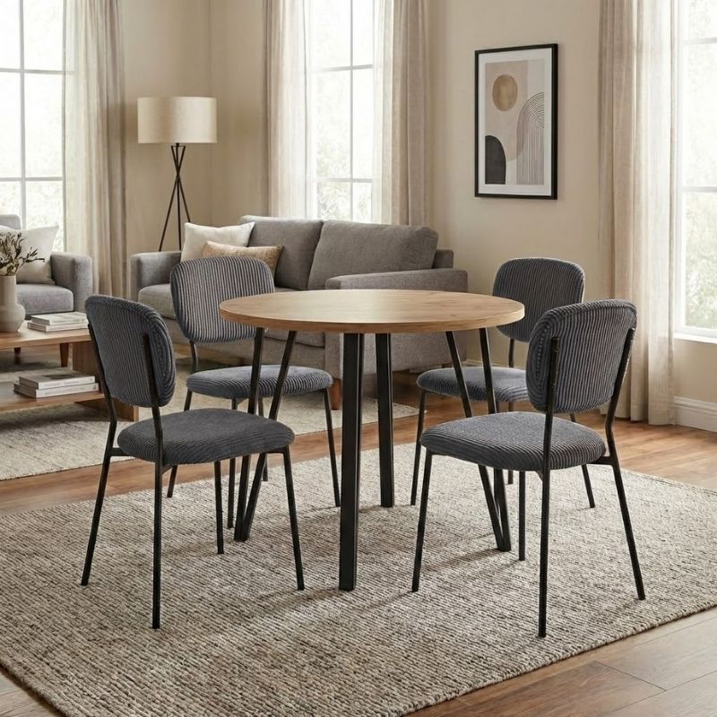 Σετ τραπεζαρία 5τμχ Xana - Kevin Megapap χρώμα sepet oak - γκρι Ø90x77,5εκ.Η τραπεζαρία Xana - Kevin θα φέρει μία αίσθηση εκλεπτυσμένης κομψότητας στον χώρο σας. Το πλούσιο κοτλέ ύφασμα της καρέκλας χαρίζει ζεστασιά και υφή, ενώ τα μεταλλικά πόδια προσδίδουν μοντέρνο χαρακτήρα και σταθερότητα. Ιδανική επιλογή τόσο για το σπίτι όσο και για επαγγελματικούς χώρους που θέλουν να επικοινωνήσουν ποιότητα και design σε κάθε λεπτομέρεια.