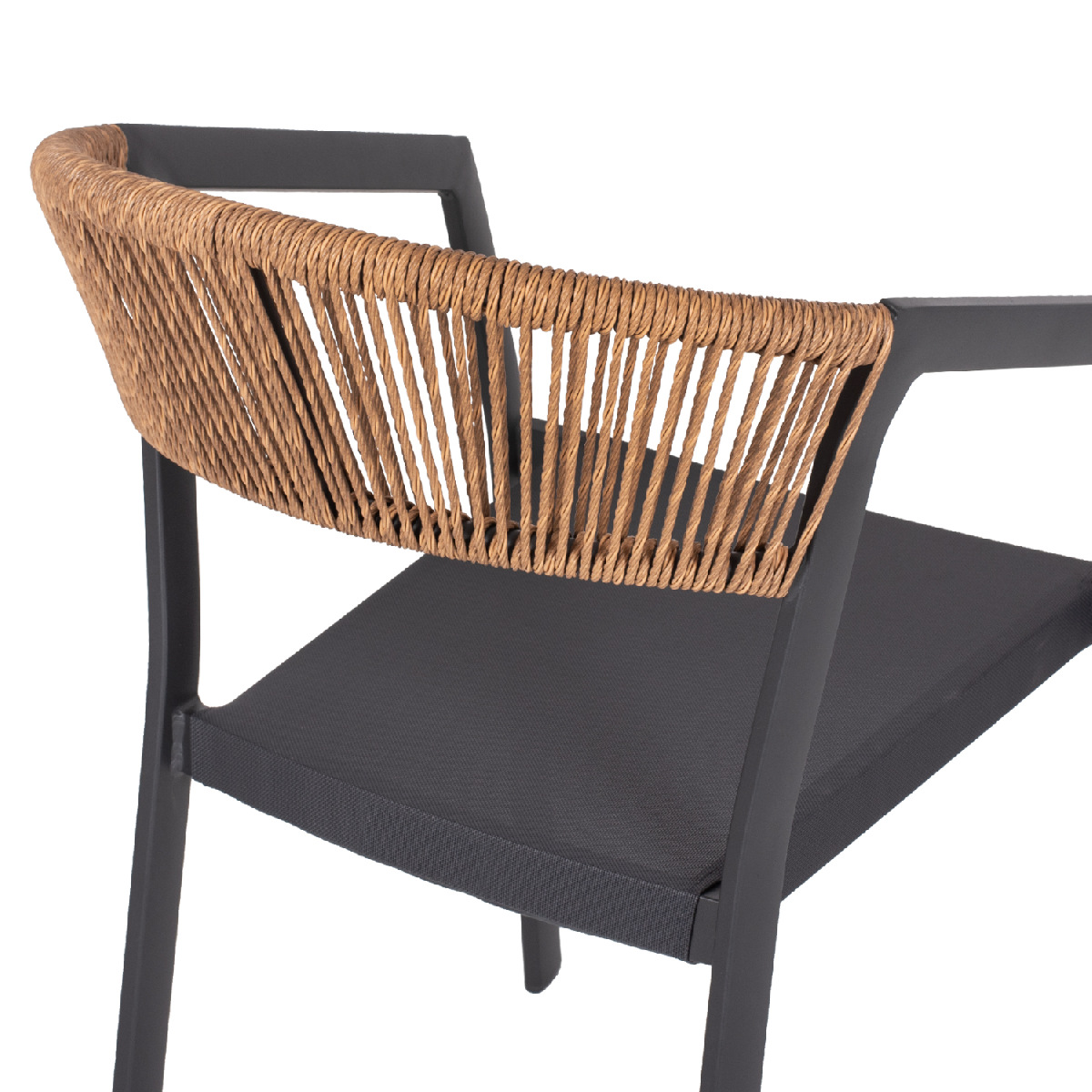 Η πλάτη της πολυθρόνας είναι επενδυμένη με πολυεστερικό RATTAN. Στα περισσότερα έπιπλα κήπου και γενικά σε έπιπλα για εξωτερικούς χώρους χρησιμοποιείται συνθετικό υλικό από PVC, δηλαδή τεχνητές ίνες υψηλής ποιότητας. Αυτό δίνει στην κατασκευή εξαιρετική αντοχή και ανθεκτικότητα σε ακραίες συνθήκες ζέστης ή κρύου.