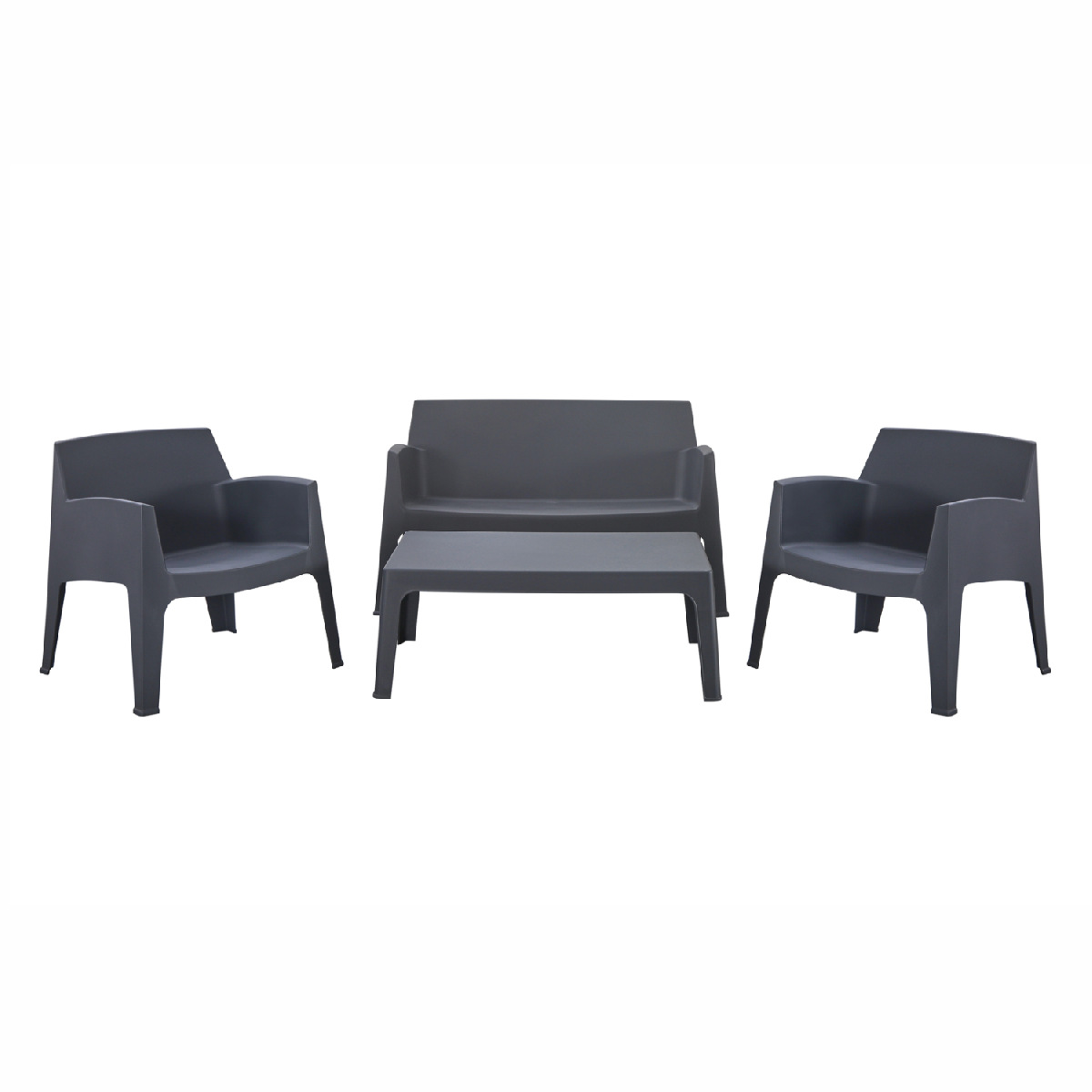 Ένα ορθογώνιο τραπεζάκι, 2 στοιβαζόμενες πολυθρόνες κι έναν 2-θέσιο καναπέ, τα οποία είναι εξολοκλήρου κατασκευασμένα από πολυπροπυλένιο σε ΓΚΡΙ χρώμα. Σχεδιαστικά, είναι λιτό και μπορεί να χρησιμοποιηθεί με πολλούς τρόπους προσφέροντας πρακτική και ανθεκτική χρήση. Ιδανική πρόταση για χρήση σε εξωτερικούς χώρους, είτε επαγγελματικούς (χώροι δεξιώσεων, εταιρείες catering, κλπ.) είτε για το σπίτι.